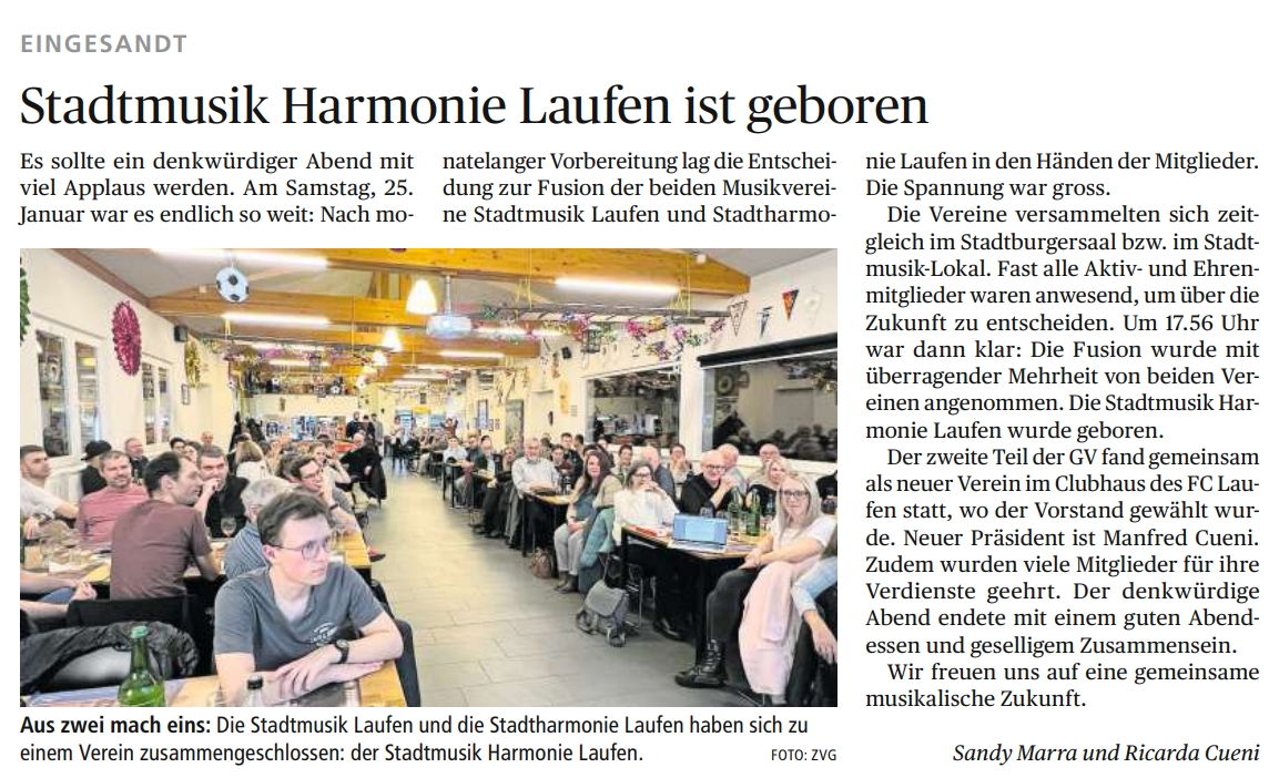An den Generalversammlungen vom 25. Januar 2025 beschlossen die beiden Blasmusikvereine von Laufen, die Stadtharmonie Laufen und die Stadtmusik Laufen sich zusammenzuschliessen.